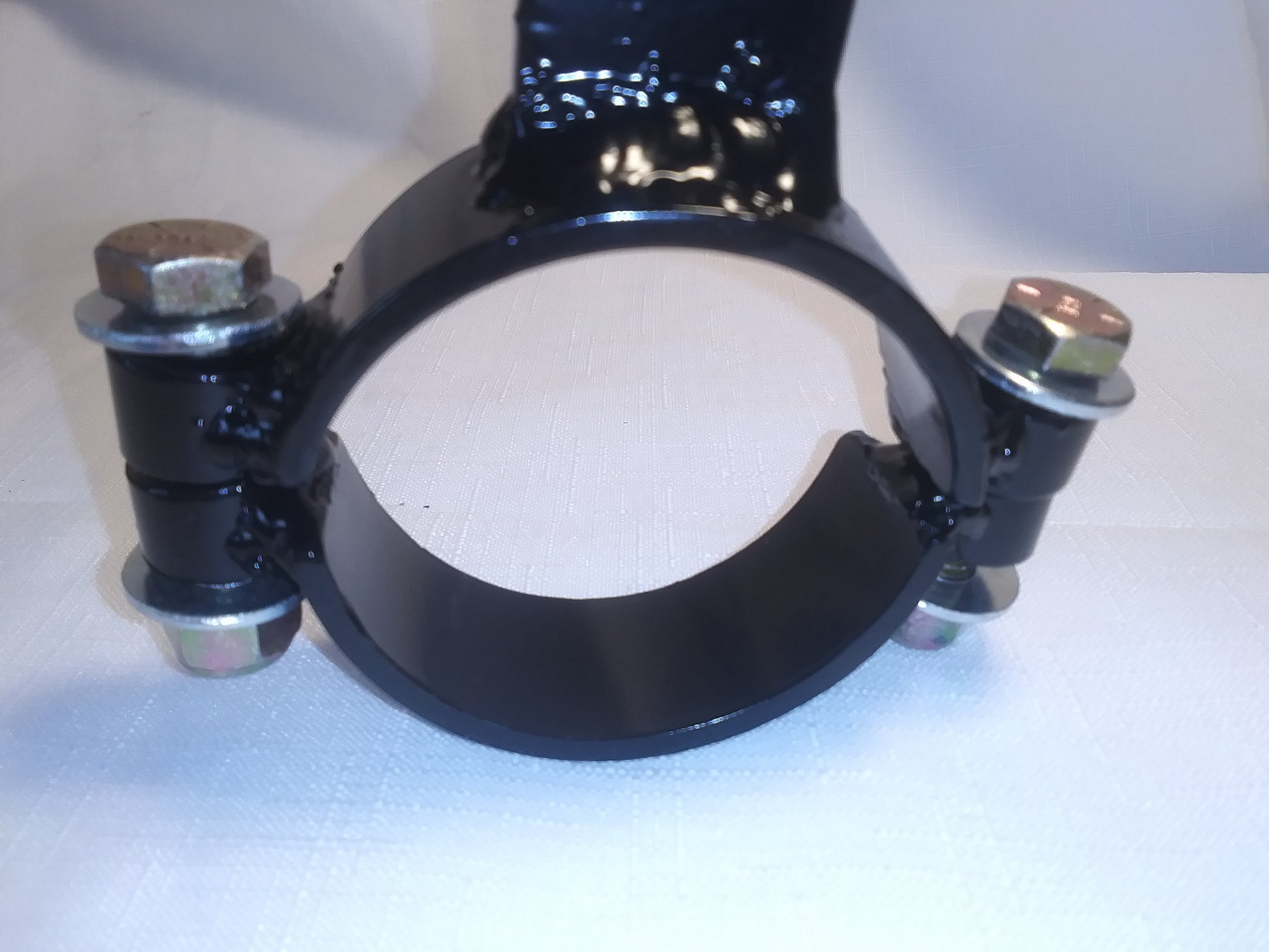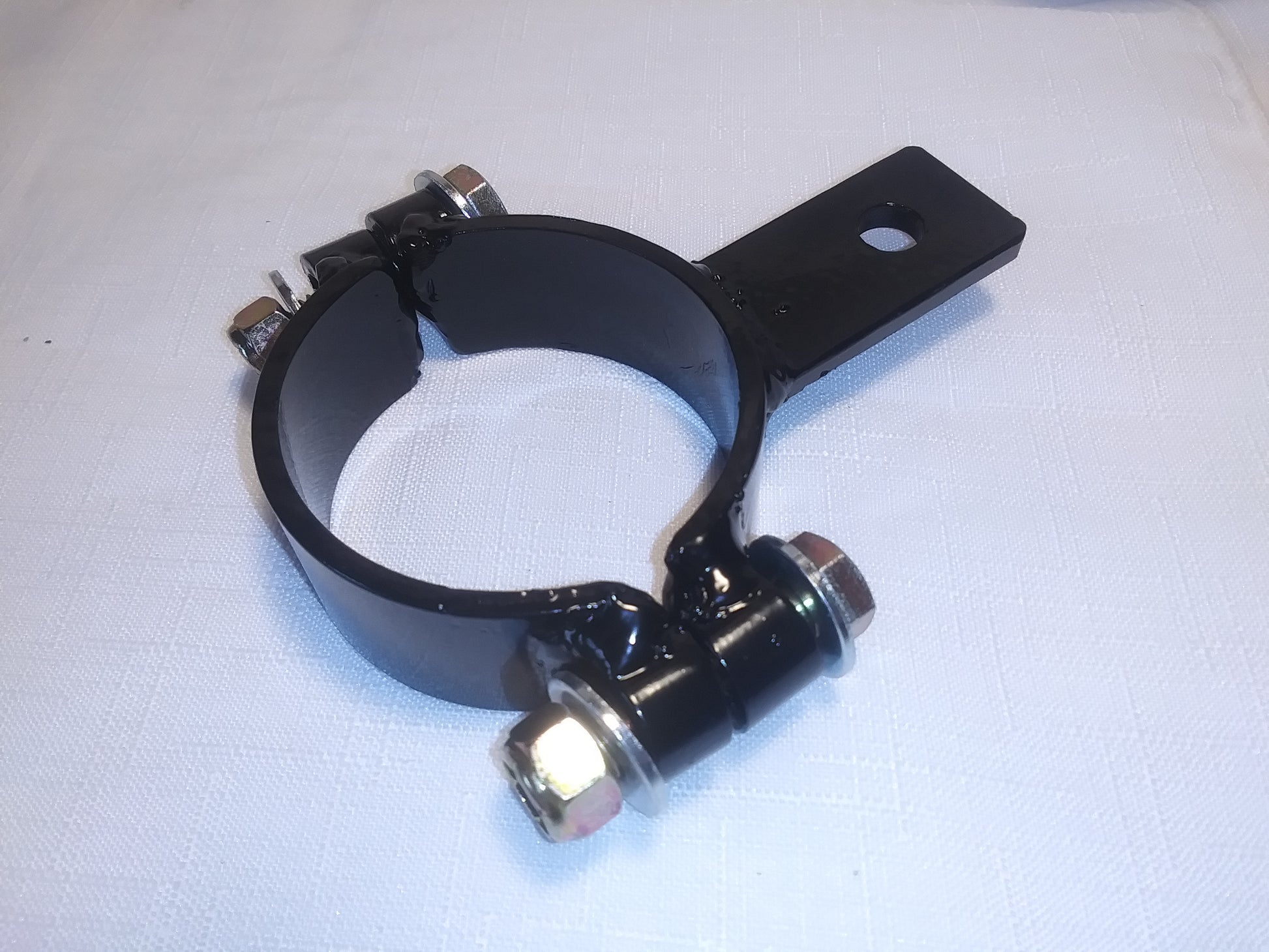 Motorcycle Fork Clamp Black 2-1/2'' O.D. 2-1/4" I.D. Attaches to front fork slider of motorcycle and steering damper bolts to tab with 3/8'' mount. Fits Harley-Davidson Touring Dressers with 41mm forks from the 1970's up to the mid 2000's approximately when they started using different size forks on just some of the Touring models. Also fits many other motorcycles. Painted with gloss black enamel. Attaches just above the fender bolt mounts on the slider, see picture.