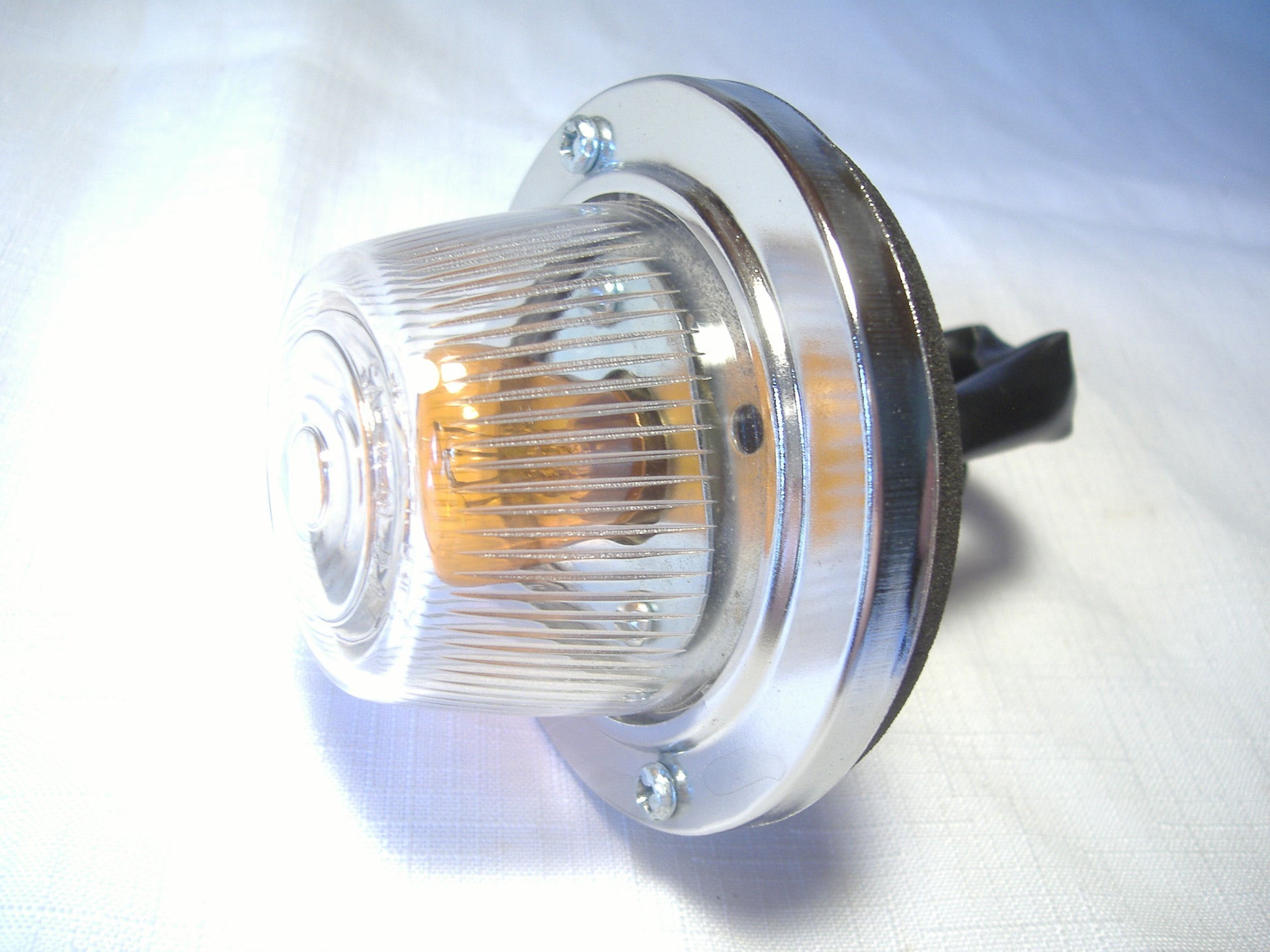 One dual filament amber marker light. Base is 3-1/4" in diameter. Has chrome ring holding on clear lens. Bulb is a 1157 dual filament amber bulb. Can be used as a marker light and turn signal. Will need to drill a 3/4'' diameter hole in fender to fit light socket base thru. Light socket extends 1-1/4" into wheel well. Light grounds thru base.