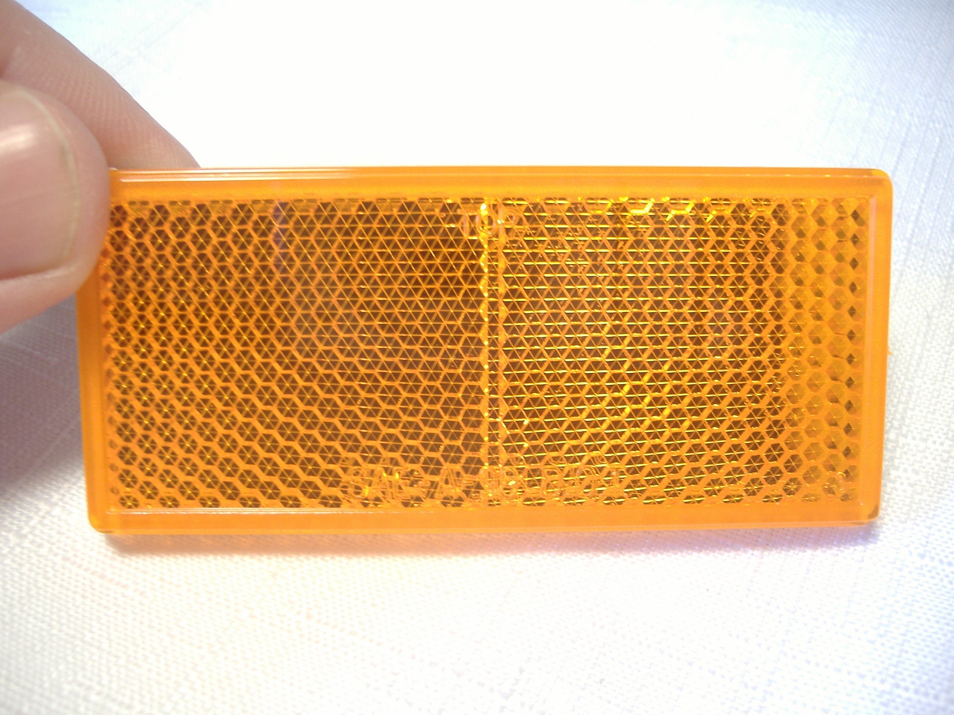 Amber reflector to stick on sidecar fender or body. 1-7/16 wide by 3-3/16" long. Stick this reflector on the side of the fender or front and side of the body and be seen at night. One amber reflector.