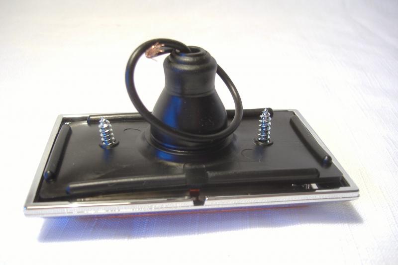 Amber side marker light for California Sidecar Friendship I & FS II models. This is a Grote reproduction of the old-style Peterson light that CSC used. It is a chrome plated ABS housing, 3 3/4'' long by 2 3/8 tall with two mounting screws on 2'' centers. Ground is by mounting screw. Socket requires 1-1/8'' hole. CSC Part # SO47. Single filament light bulb. New light looks great!