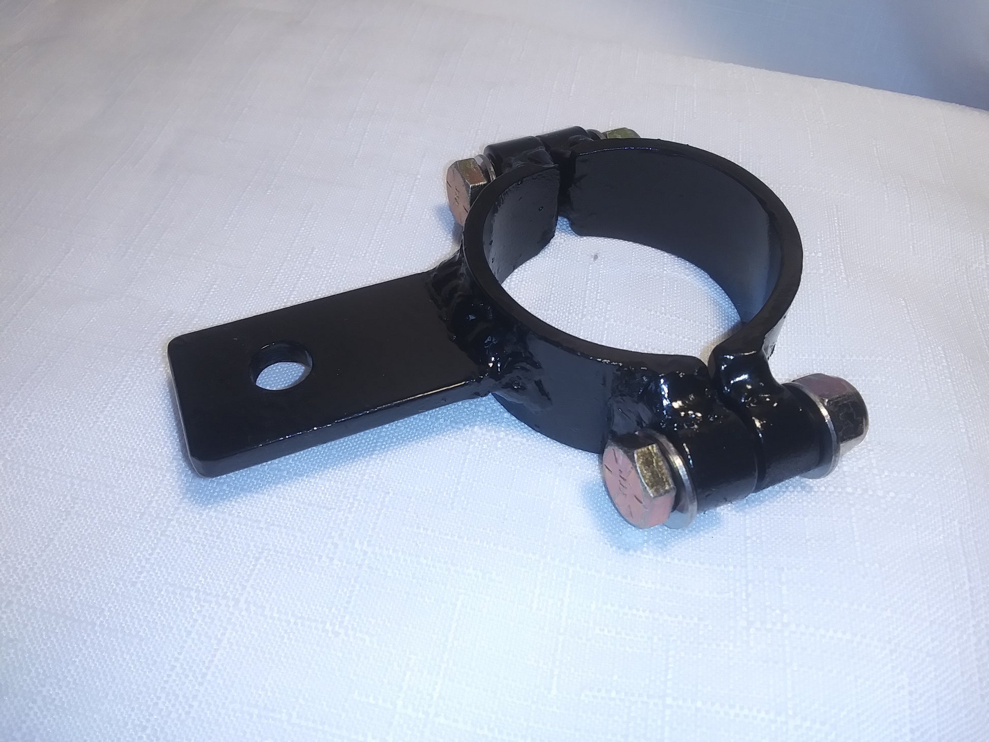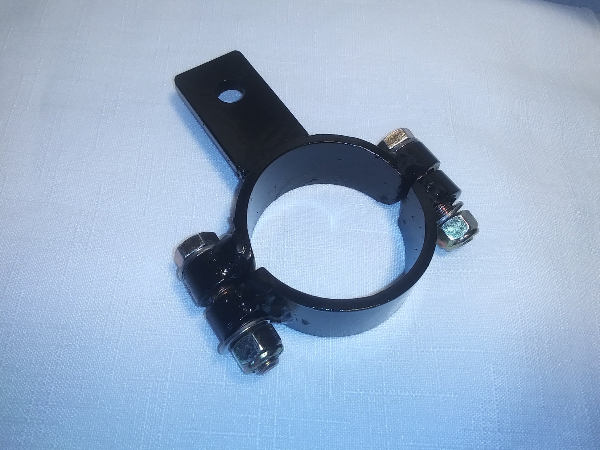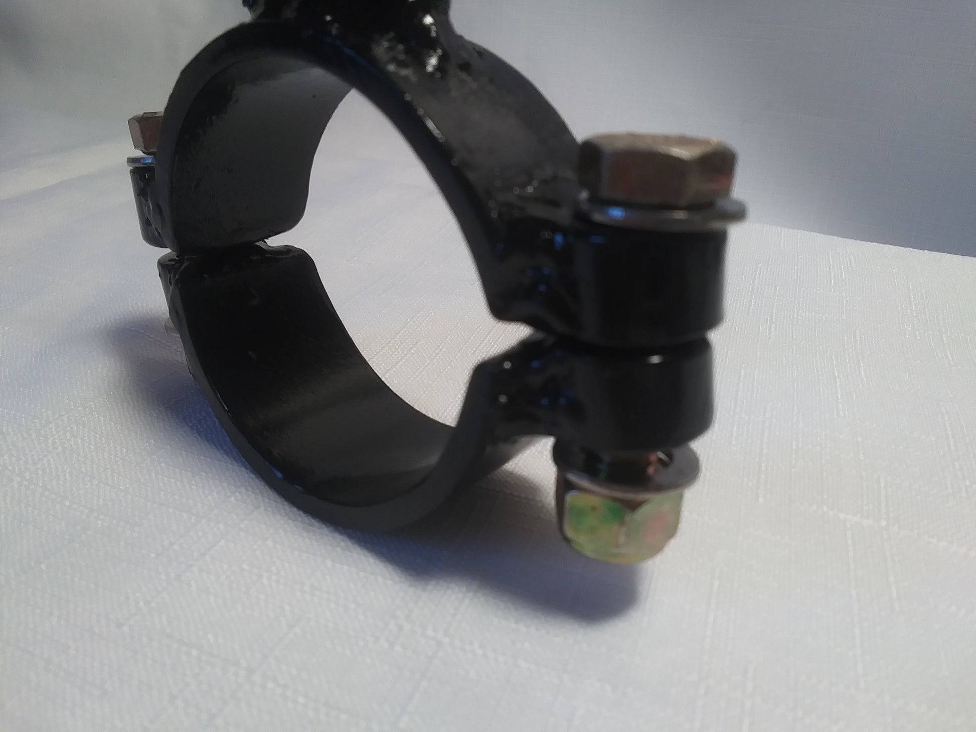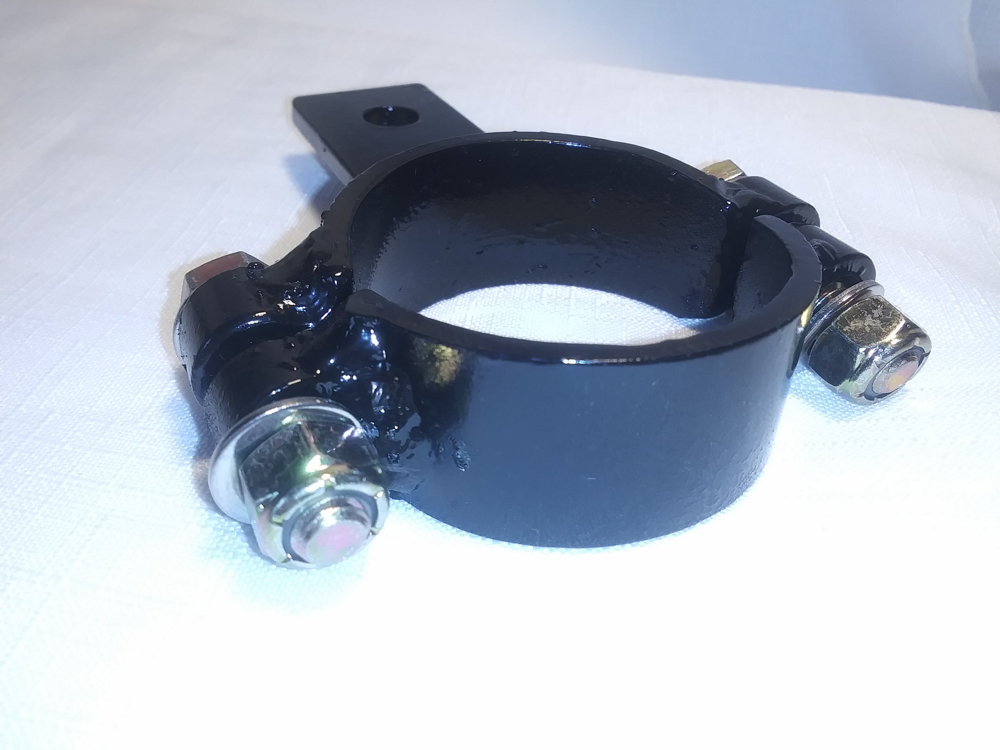 Steering Damper Motorcycle Fork Clamp Mount 2'' I.D. Painted black. O.D. 2-1/4". Attaches to front fork slider of motorcycle and steering damper bolts to tab with 3/8'' mount.