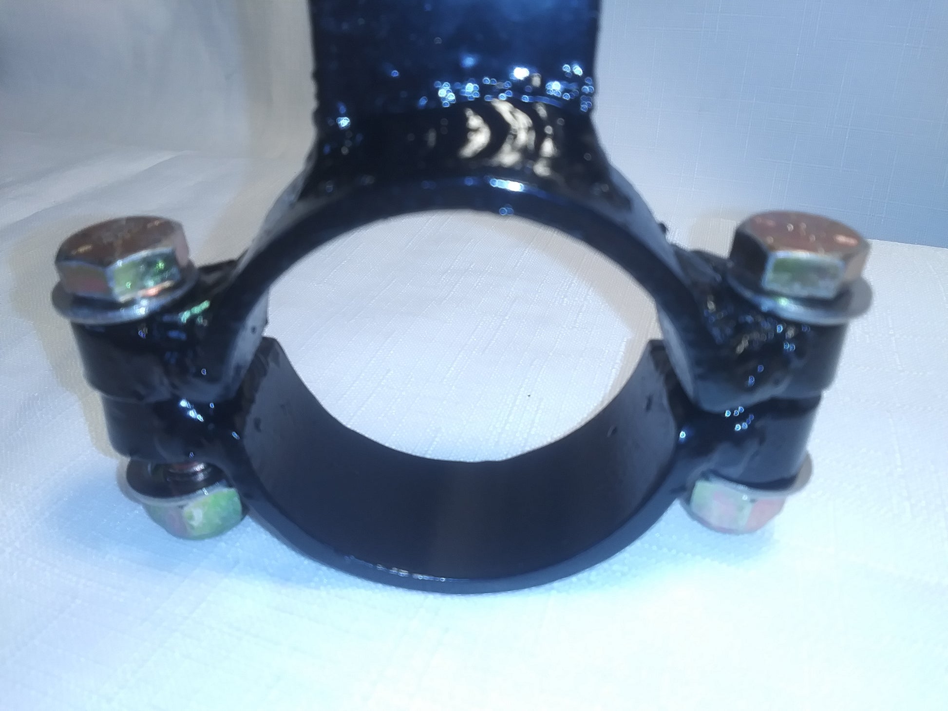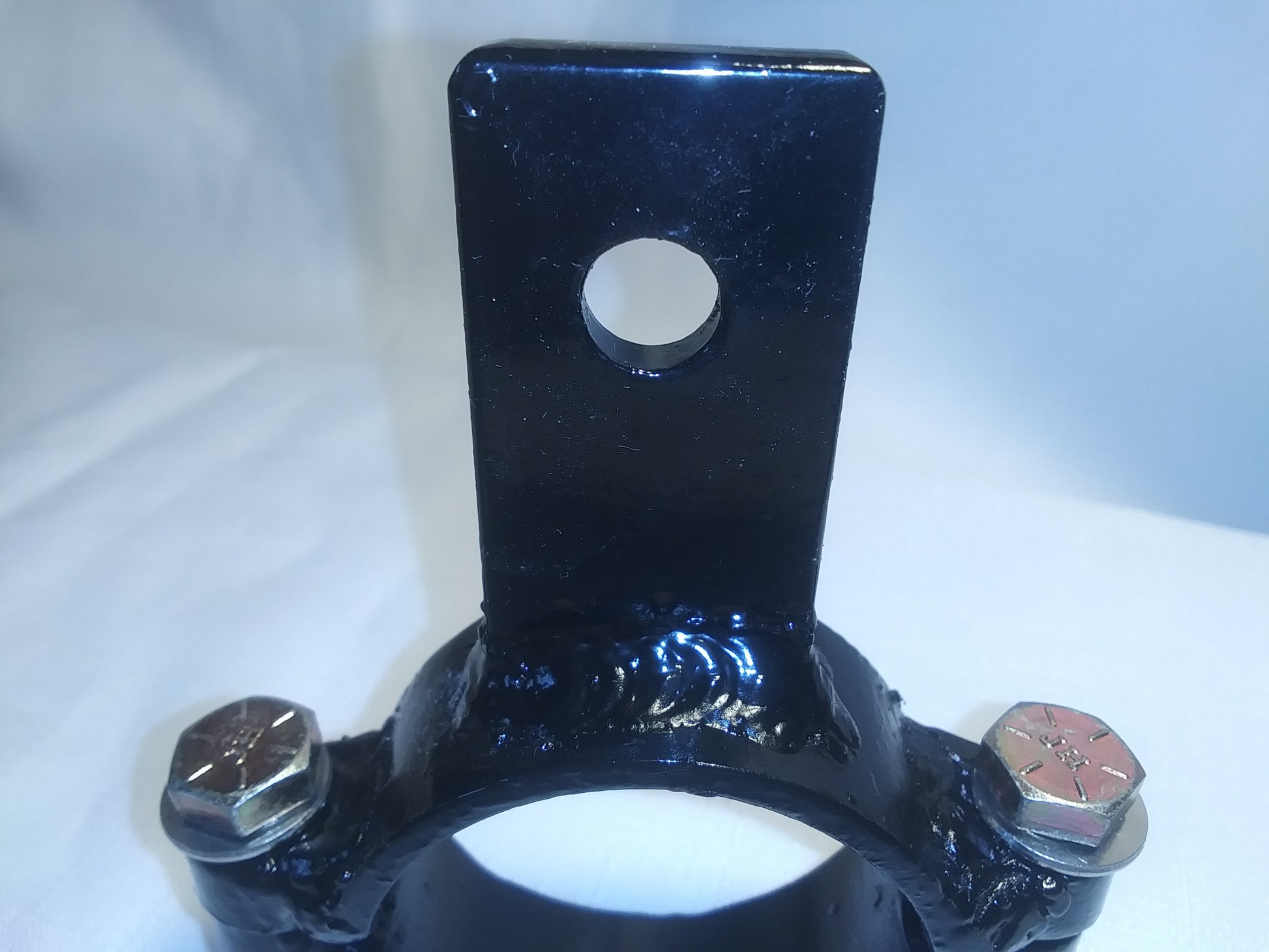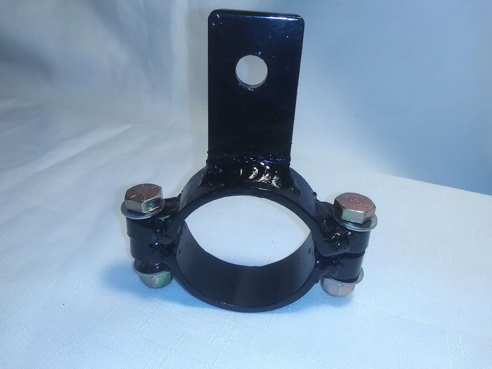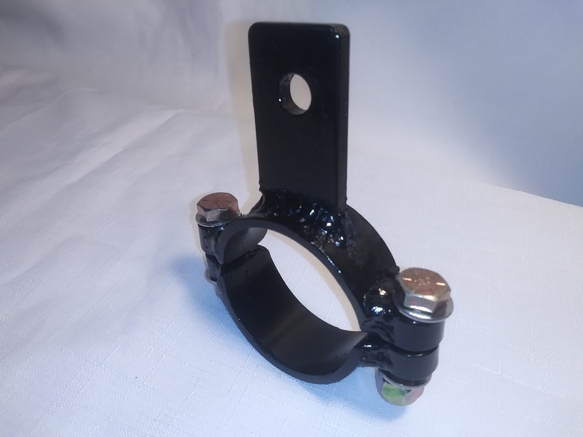 Steering Damper Motorcycle Fork Clamp Mount 2'' I.D. Painted black. O.D. 2-1/4". Attaches to front fork slider of motorcycle and steering damper bolts to tab with 3/8'' mount.