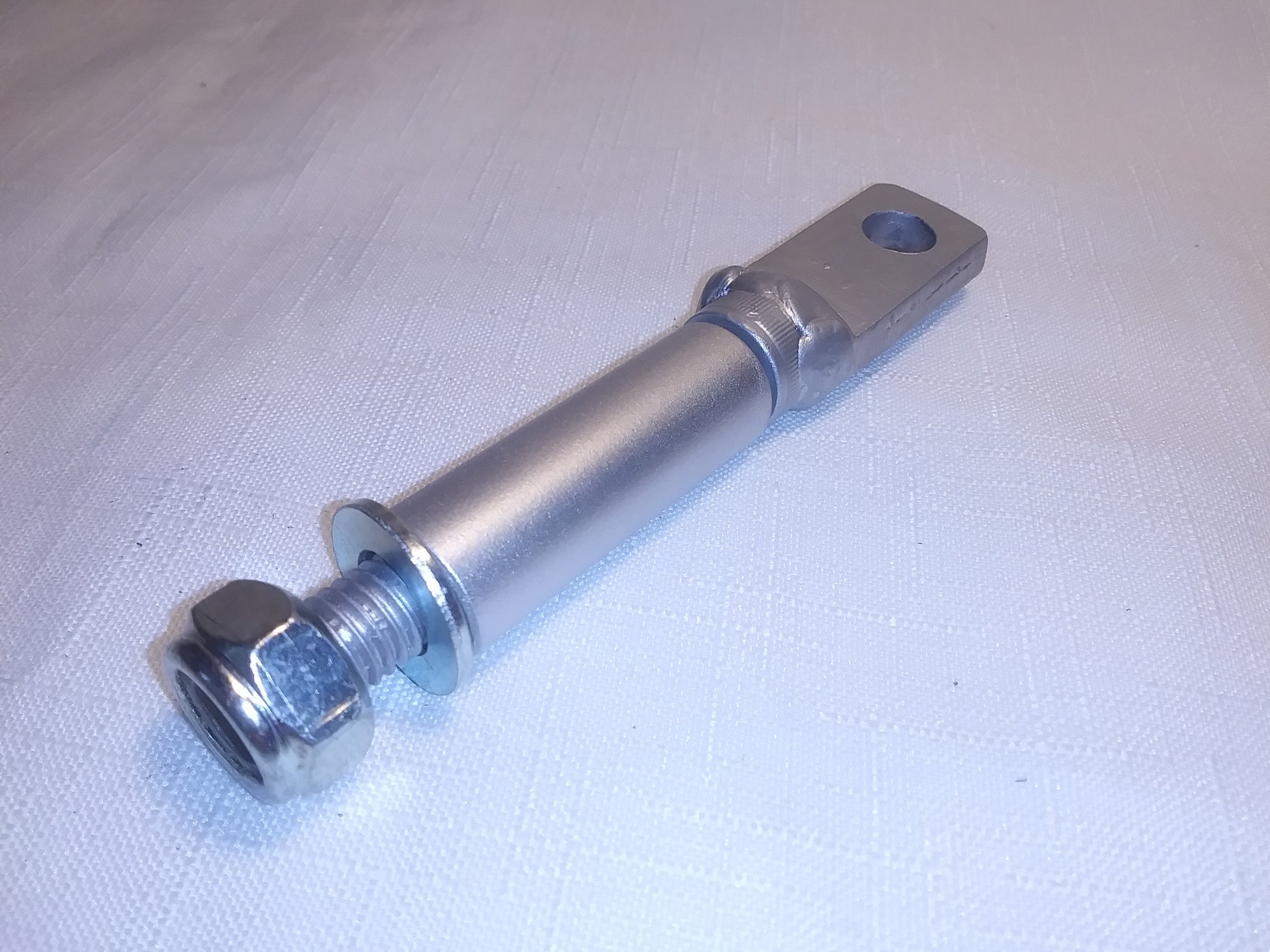 California Sidecar fork mounting bolt bracket for steering damper. Used on Honda Goldwing 1500. Goes through the front brake caliper mount. Bolt is 10M-1.5 tpi. Bracket mounting hole for Heim joint is a little over 3/8" (25/64" exactly). Bolt shank is 2-9/16" long. Mount overall length is 4-1/2". Painted silver. See California Sidecar mounting instructions diagram. Requires drilling a hole. Comes with space, washer and lock nut. CSC # S044-5