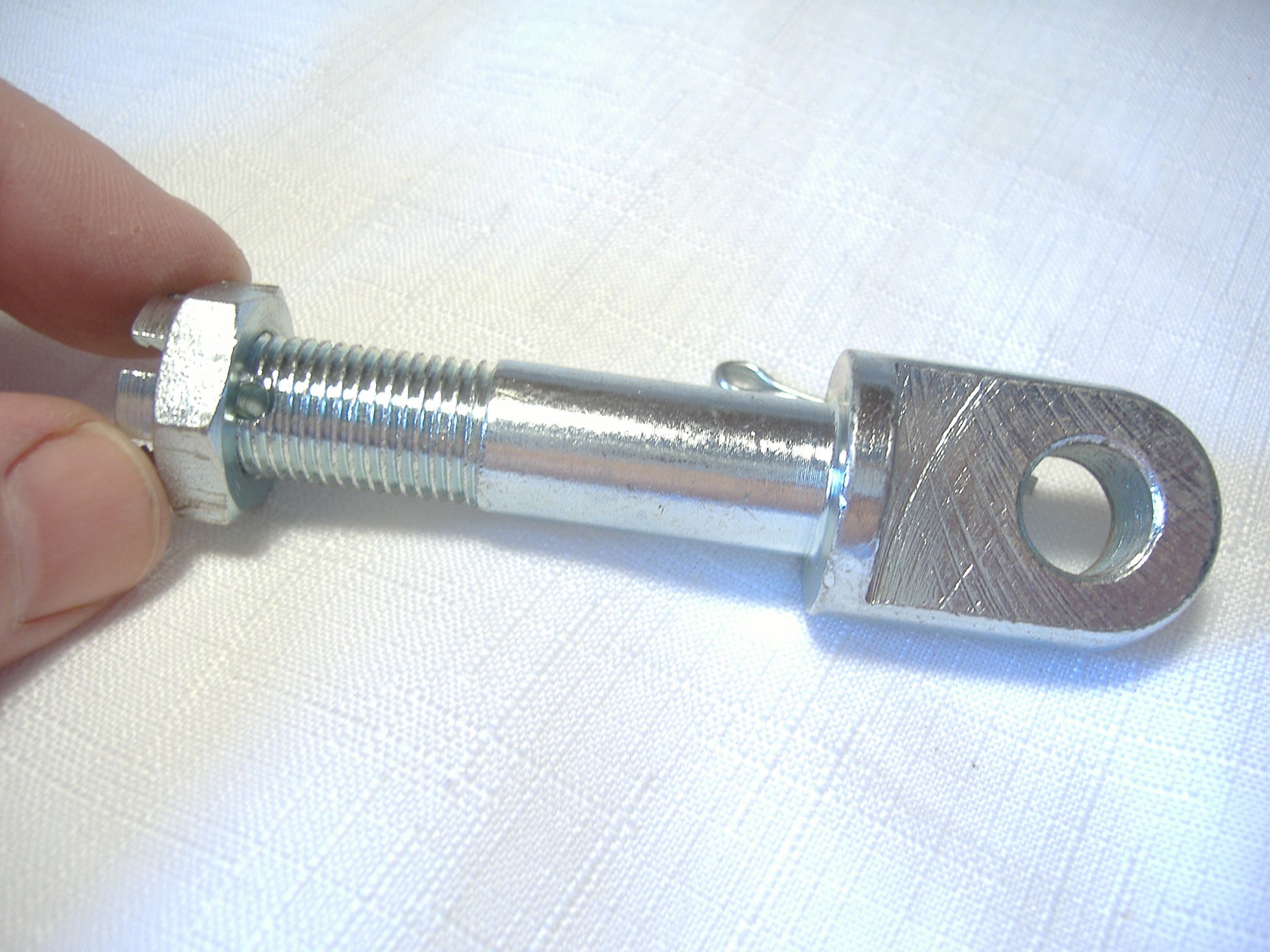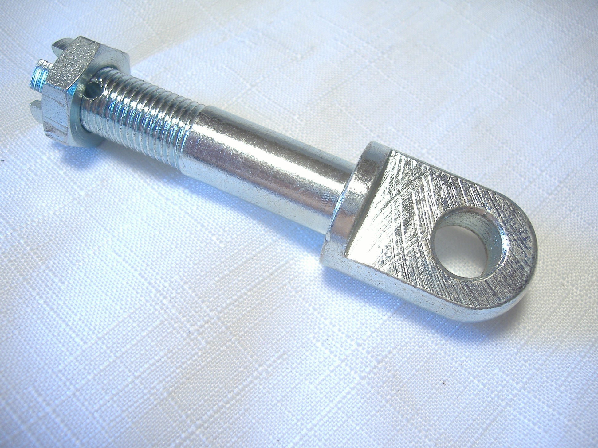 One metric I-bolt sidecar strut mount with castle nut and cotter pin. 93mm overall length. Shaft is just over 14mm in diameter and 56mm long including 24mm of thread. Head is 12mm thick with a 12mm hole. I just have this one in stock.